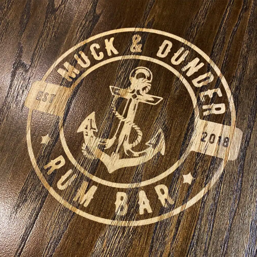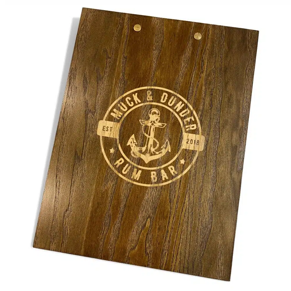 Wood engraving is known for its fine lines and is a printing method that lends itself beautifully to our real wood menu covers. A wood engraving is made by cutting and burning an image into the grain of hardwood (i.e. the front, back or spine of your menu cover). To apply colour, the engraved area is subsequently filled with a special type of paint. Multiple colours can be used (just like screen printing), so long as they don’t touch. However, for a more authentic look, many of our customers leave the engraving as is.