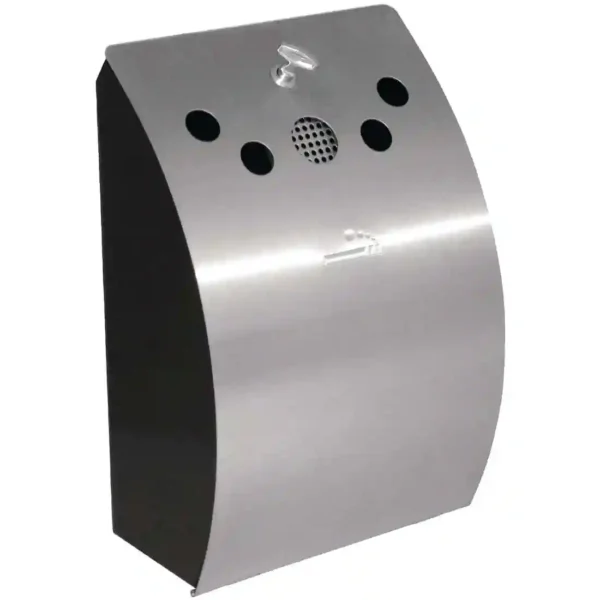Stylish curved design stainless steel wall mounted ashtray, with four holes for cigarette ends. Suitable to use in any outdoor smoking area, featuring a lock with removable galvanised steel inner tray for easy emptying.