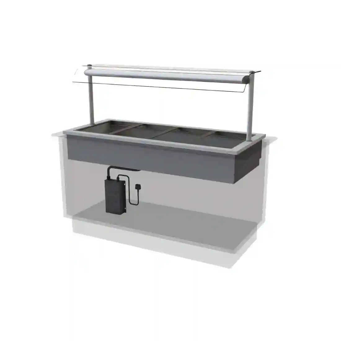 Display, illuminate, heat and protect pre-cooked food with CED’s elliptically shaped Designline self help dry heat bain marie drop in display. This 4/1 Gn size hot display features a 4/1Gn heated tank area and individual 1/1Gn gastronorm container support collars, which accept various sized Gn containers up to 150mm deep . The display fits into a pre-formed cut out made in a countertop . The self help superstructure is made from bright polished steel and alluminum curved profiles, with curved, toughened glass sneeze screen protection to the customer side of the display. Product illumination/ surface heat is provided by infra red quartz heat lamps, housed in the elliptical profile gantry. Base heat and surface heat can be adjusted & ‘locked’ from the operator side of the gantry, by digital temperature display ( control panel ) and adjustable dimmer switch, mounted at eye level. The display has 24 hour operation & is factory set to hold food core at 85 deg. C. Modular removable heater element covers in the heated well give even heat spread & make for easier cleaning. The display comes complete with lifting kit for installation and is supplied with a concealed control box & plug top on a 2M lead. GN’s Sold Separatley.