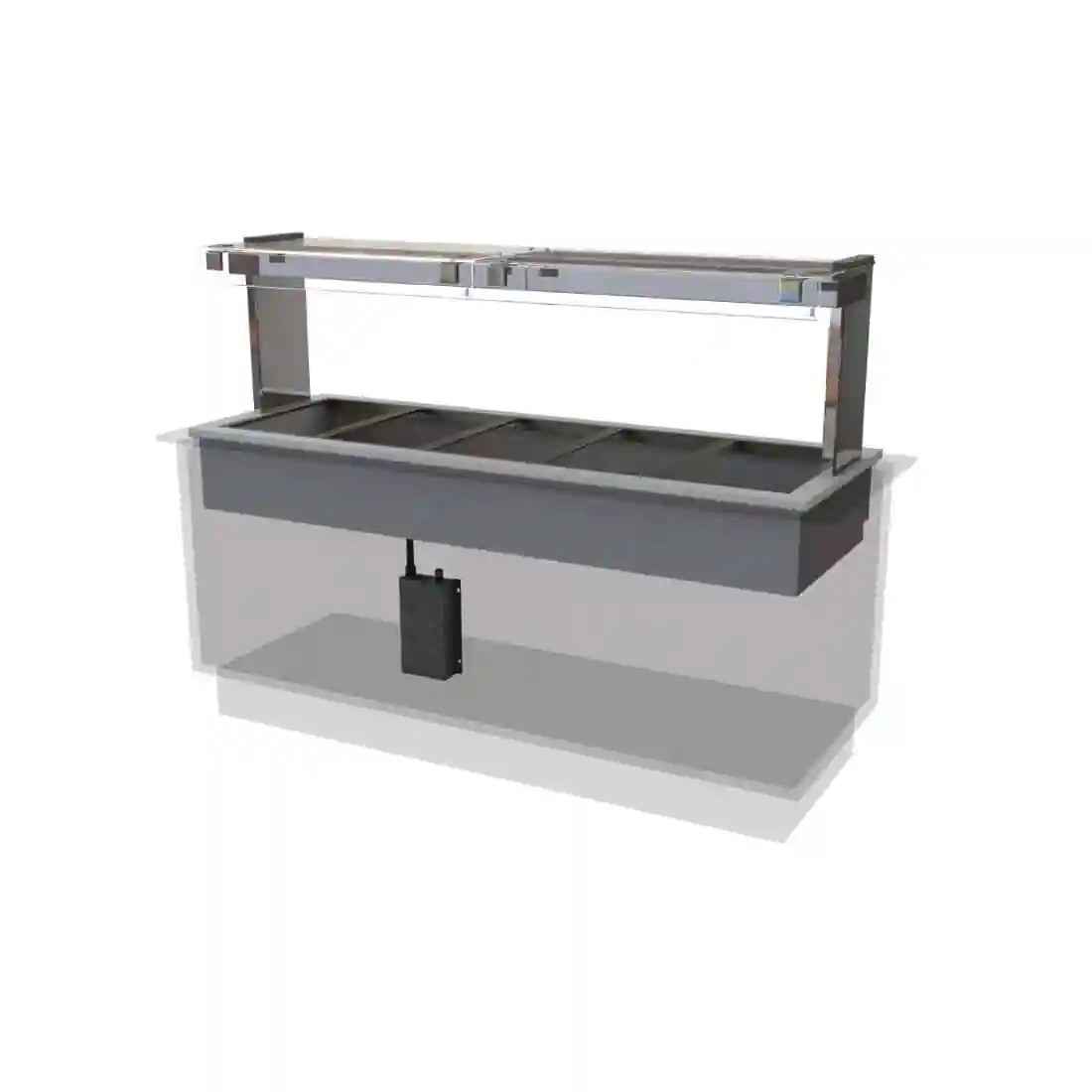 Display, illuminate, heat and protect pre-cooked food with CED’s rectangular shaped Kubus self help dry heat bain marie drop in display. This 5/1 GN size hot display features a 5/1 GN heated tank area and individual 1/1 GN gastronorm container support collars, which accept various sized GN containers up to 150mm deep . The display fits into a pre-formed cut out made in a countertop. The self help superstructure is made from bright polished steel and aluminum rectangular profiles, with flat, toughened glass sneeze screen protection to the customer side of the display. Product illumination/ surface heat is provided by infra red quartz heat lamps, housed in the elliptical profile gantry. Base heat and surface heat can be adjusted and ‘locked’ from the operator side of the gantry, by digital temperature display (control panel) and adjustable dimmer switch, mounted at eye level. The display has 24 hour operation and is factory set to hold food core at 85°C. Modular removable heater element covers in the heated well give even heat spread and make for easier cleaning. The display comes complete with lifting kit for installation and is supplied with a concealed control box and 2M flexible electrical conduit for hard wiring to a 20 Amp, 230v 4.0KW supply. GN’s Sold Separatley.