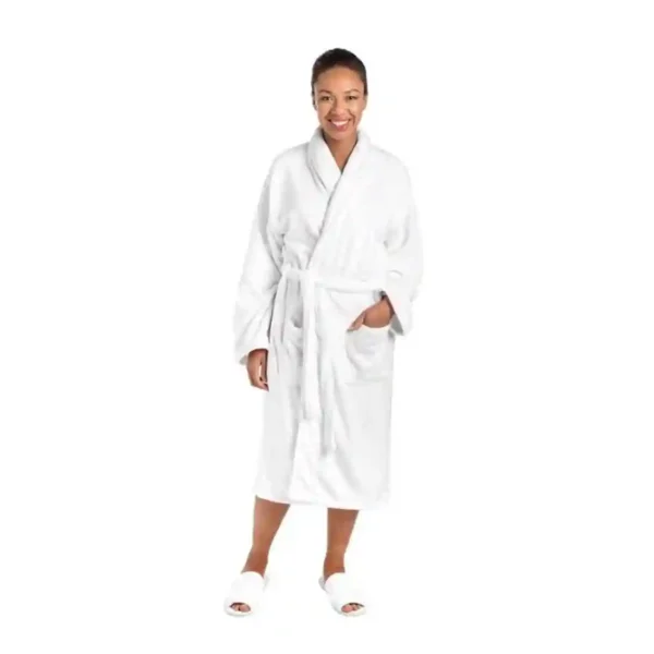 Super soft bathrobe with a shawl collar and detachable belt, ideal for keeping warm on those cold nights. Comes with a detachable belt. Weight: 300g/m². Fabric: 100% polyester. Sizes: small/medium, large.