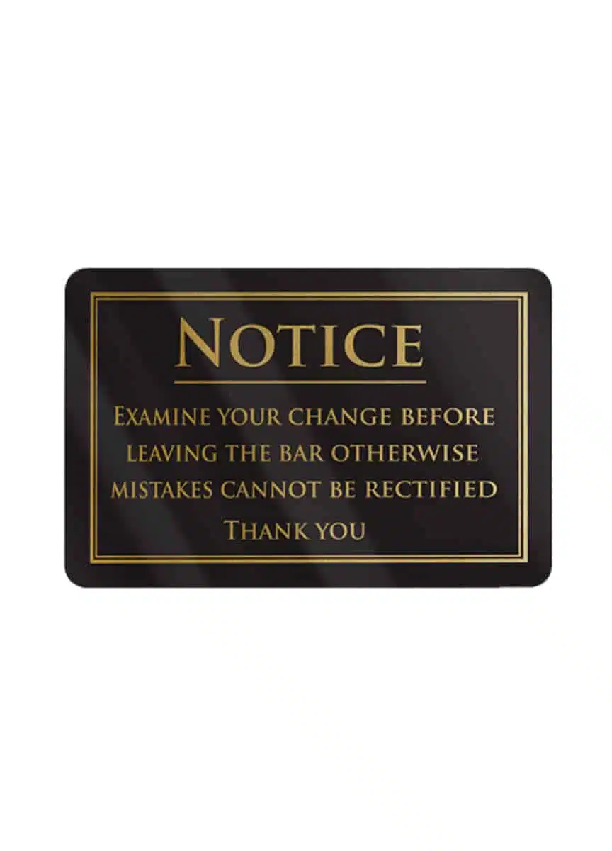 An ‘Examine Your Change’ notice bar sign is the ideal solution to money disputes. Advising guests to examine their change before leaving the bar ensures that and change dispute procedures can be handled straight away. This sign complies with UK licensing laws.