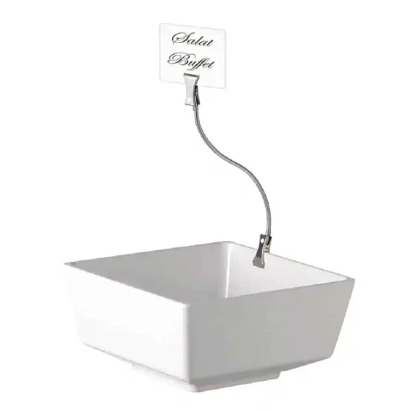 Wipe-clean plastic signs to add interest to buffet display; ideal for crocks, salad bowls etc. Fit GF176 and GF177. Suitable for use with washable pens. Metal clip sold separately.