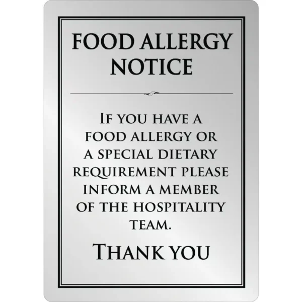 Legislation requires customers to be made aware of the fourteen different allergens in food, meaning that this sign is an affordable and practical way of keeping everyone safe when enjoying your services.