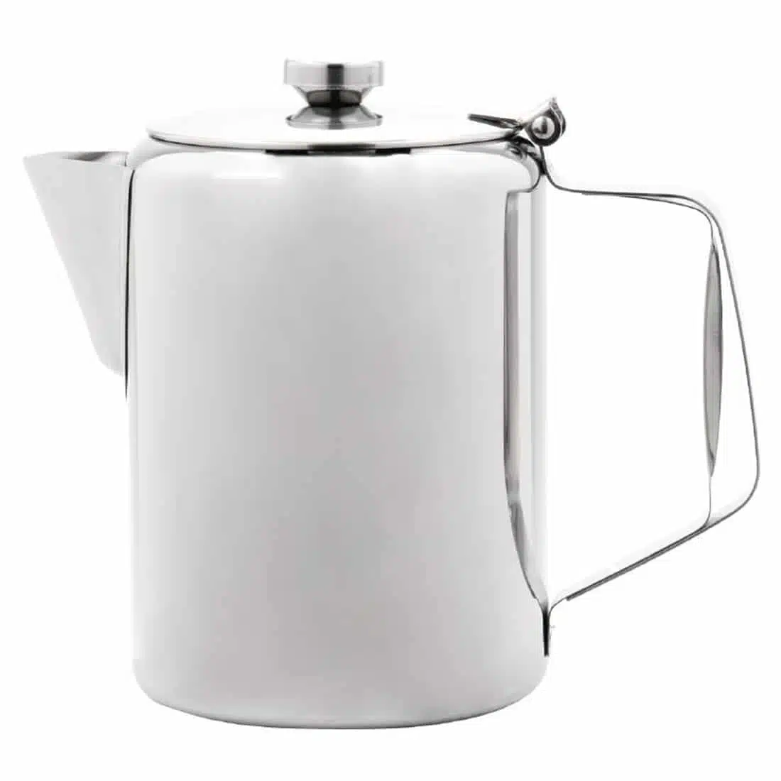 Simple range of hot beverage service items in highly polished stainless steel. Pots feature heat resistant handles.