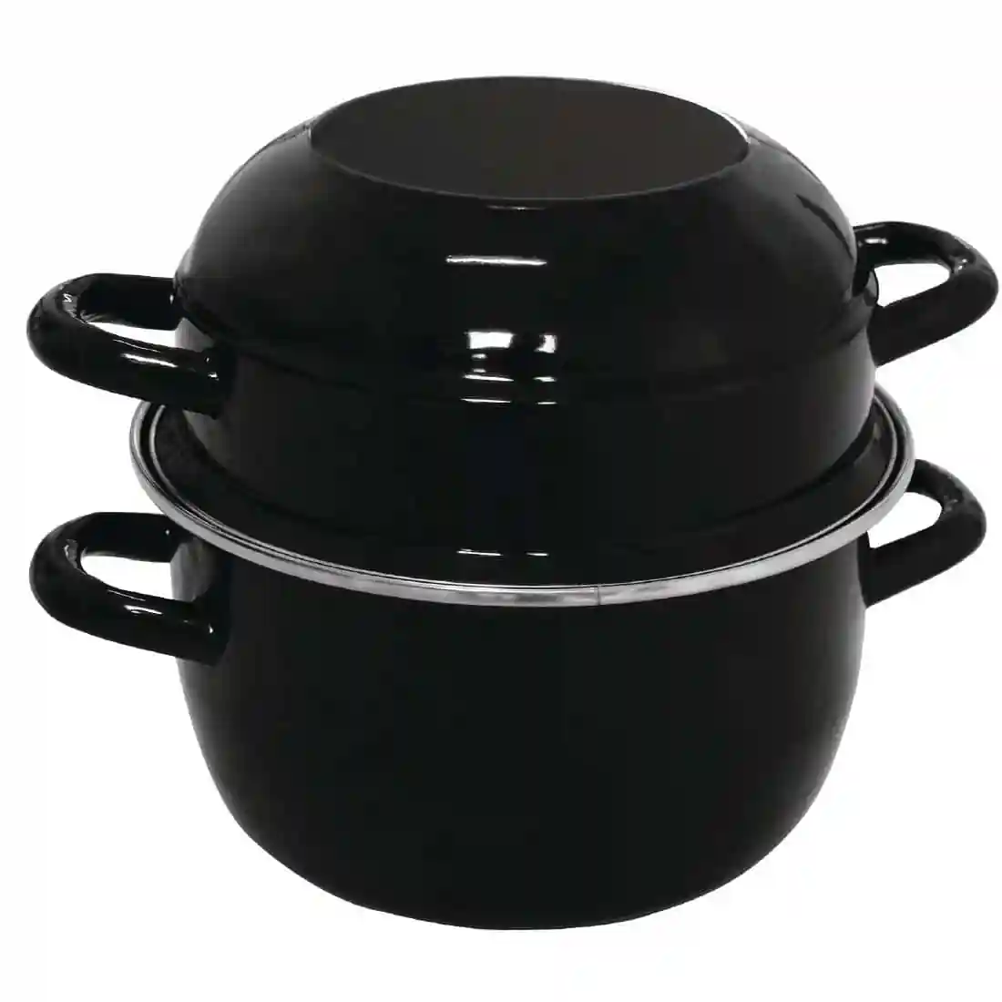 Black pot with handles and stainless steel rim, for stove to table use. Lid can be used for disposal of shells.