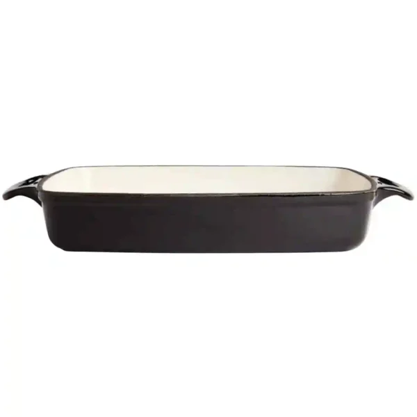Traditional cast iron dish with handles and stainless steel knob. Excellent heat retaining properties and even heat distribution. Can be used as attractive presentation.