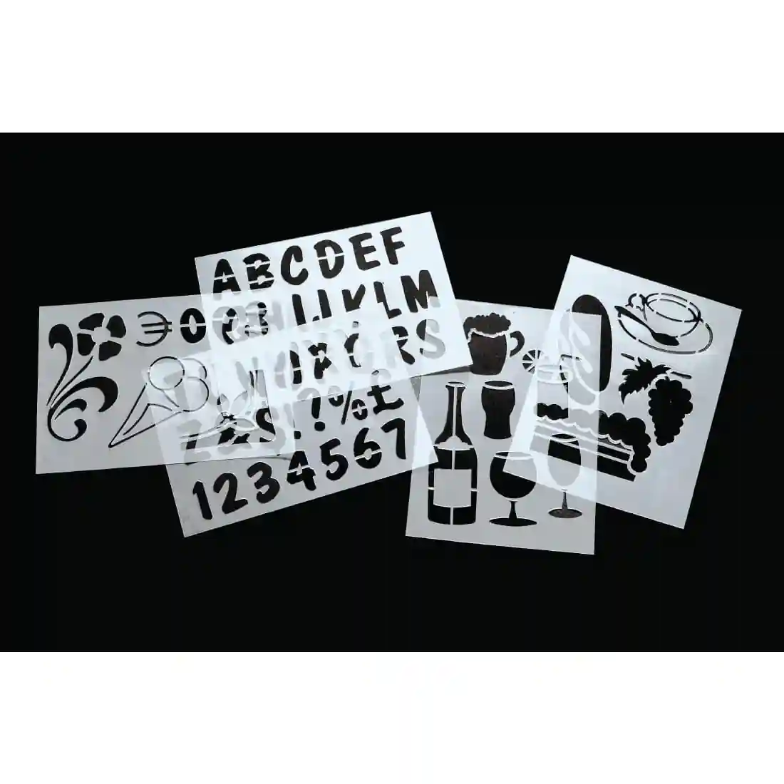 5 stencils comprising numbers, symbols, the alphabet and 13 pictures will give any board a professional appearance.