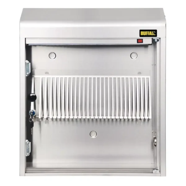 Stainless steel knife cabinet designed to reduce cross contamination. Features adjustable timer and clear door. UV light switches off automatically when door is open. Wall mounted.