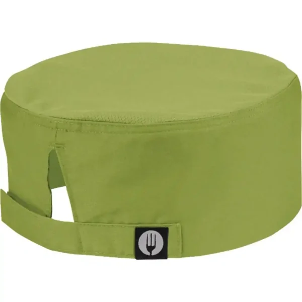 Cool Vent topped beanie encourages air circulation to keep you cool in the kitchen. One size with adjustable Velcro closure.