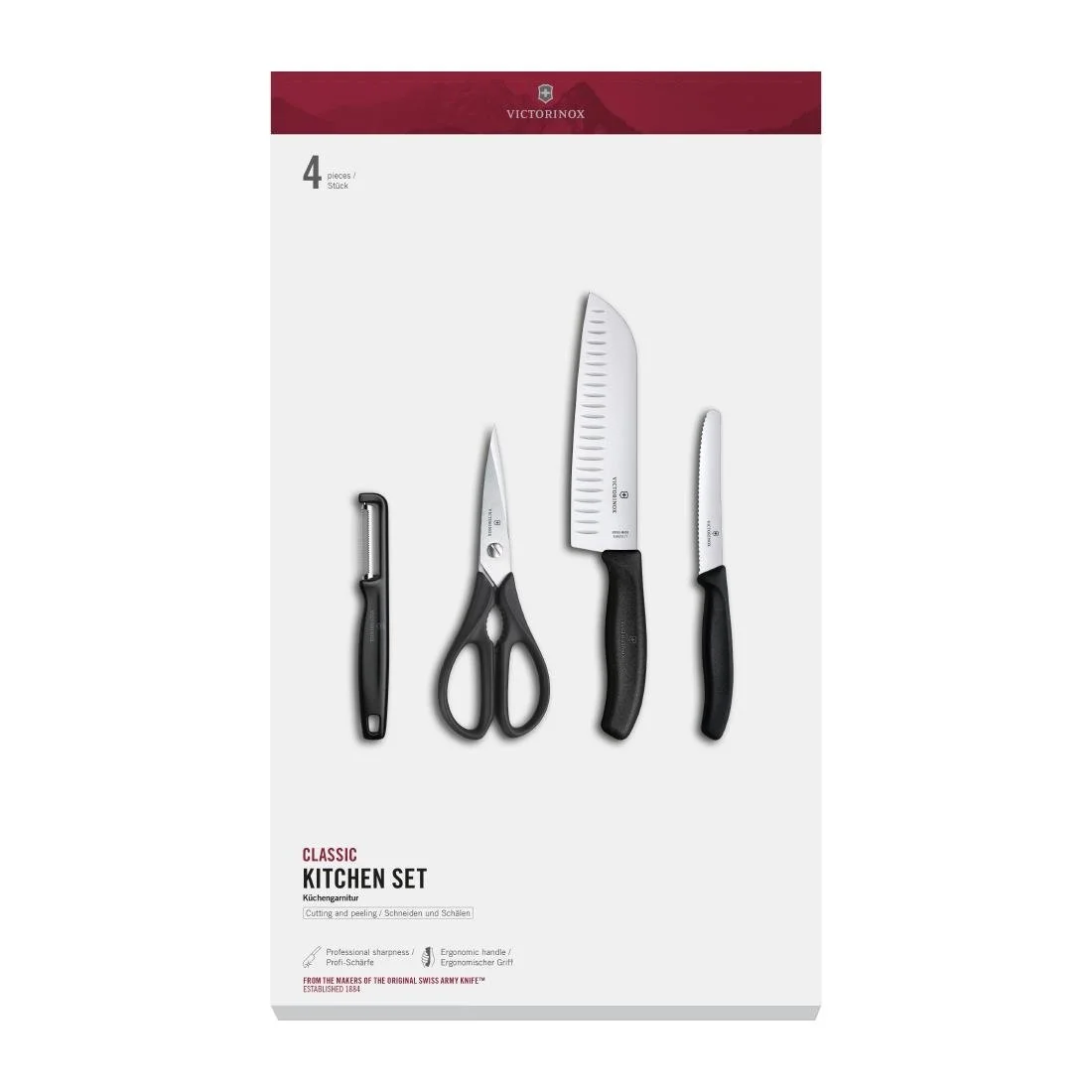 Prepare ingredients quickly and easily with this four-piece Victorinox kitchen set. The set consists of a large Santoku knife and a smaller, serrated knife, as well as a peeler and a pair of multi-purpose scissors. Whether you’re slicing vegetables or preparing fine cuts of meat, you’ll find all you need to peel and chop with ease and precision here.