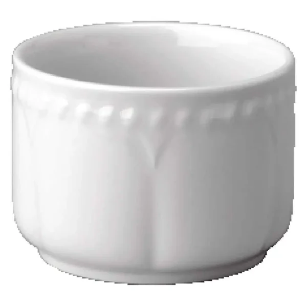 Buckingham white sugar or bouillon bowls have a distinctive rope embossed Gadroon edge and subtle fluting, perfect for any catering establishment looking for a more traditional style of tableware. Its super vitrified body has a high resistance to thermal shock which helps reduce breakages.
