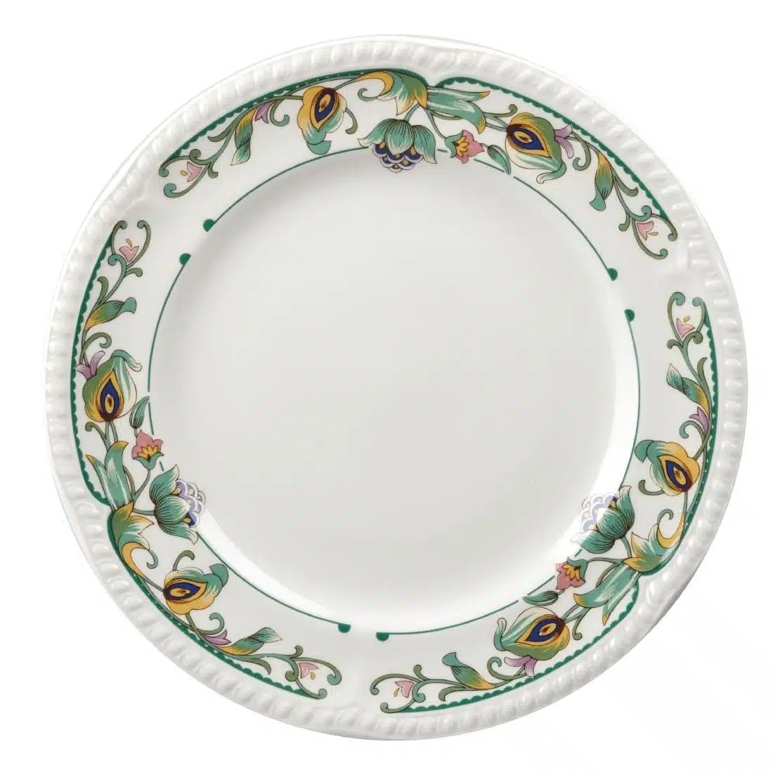 Elegant printed plates by Churchill with a tropical floral design featuring the delicate embossment of the Buckingham shape, featuring a durable glaze which provides an ultra smooth surface for presentation.