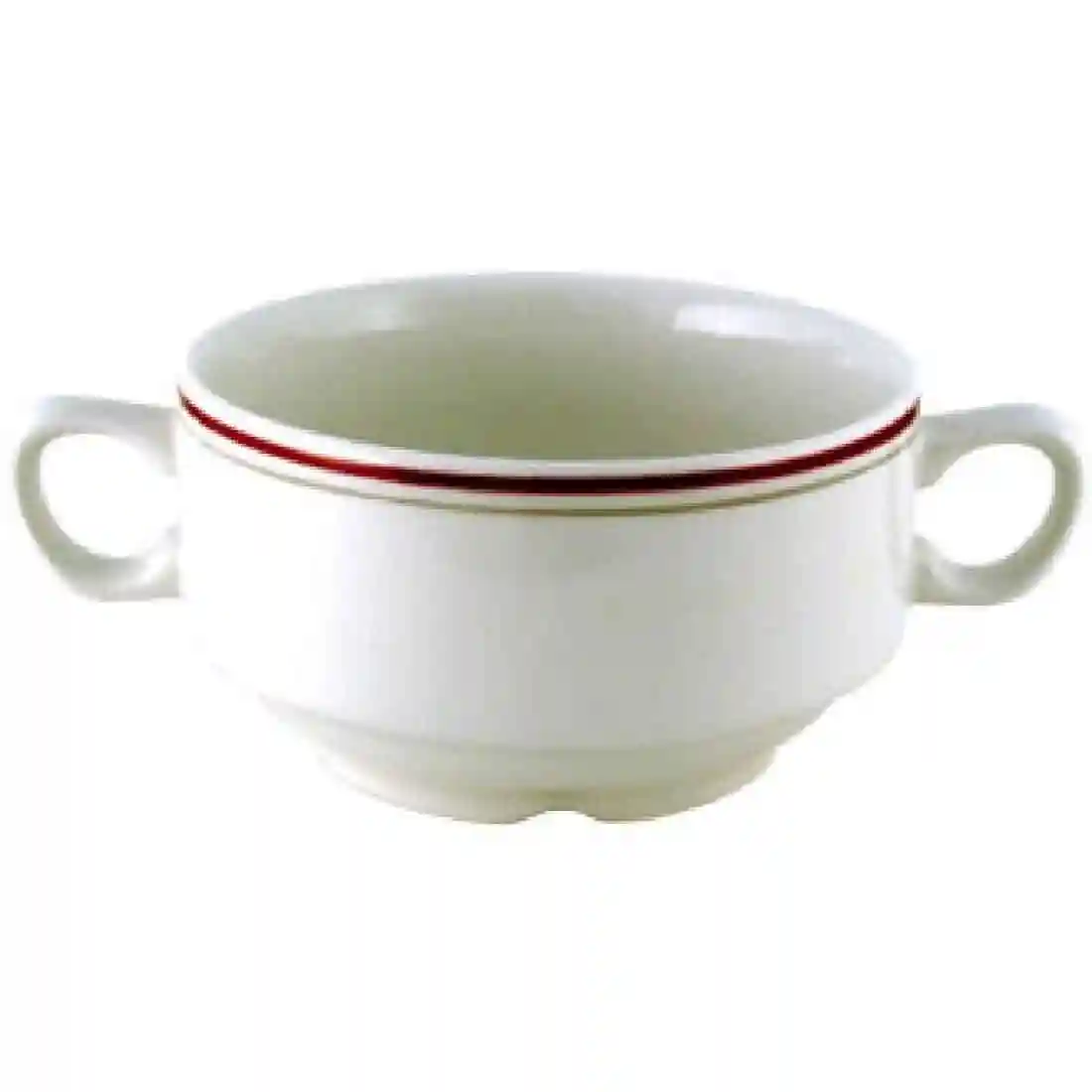 Nova collection by Churchill combines contemporary understated design with functionality and durability combined with Clyde, a simply designed elegant edging of contrasting maroon and grey bands. These handled soup bowls have a vitreous body which does not absorb moisture making them more hygienic.