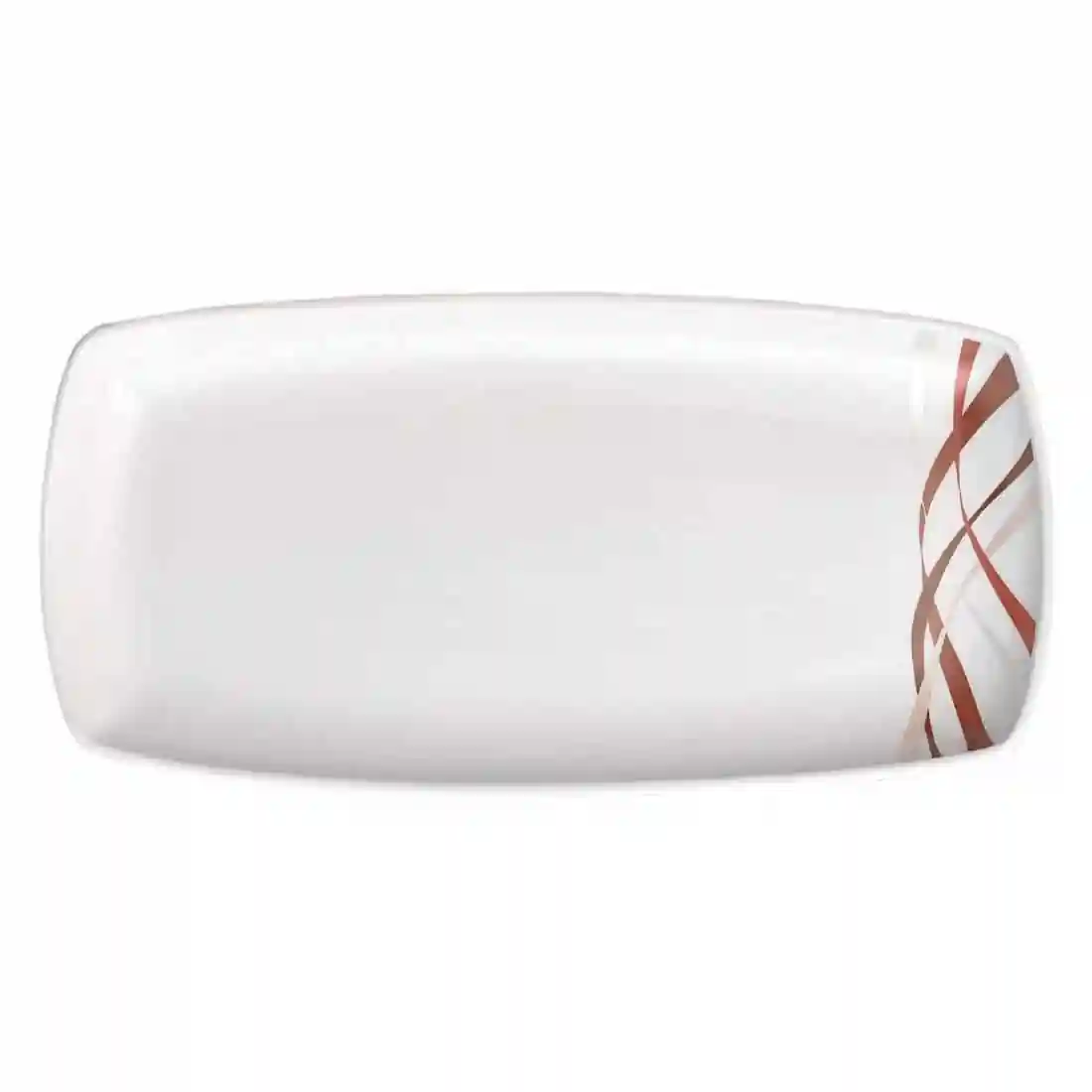 Simply decorated in soft metallic spirals of copper, chocolate and silver pearl, this oblong plate from the Helix collection creates a welcoming and relaxed ambience for your customers. Made with a durable, super vitrified body, the plate has high resistance to thermal shock and a reinforced rolled edge which can withstand a busy catering environment.