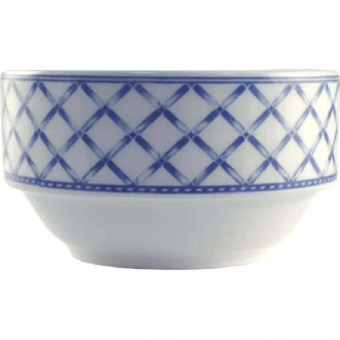 Make a statement with the blue and white trellis design of this Pavilion consomme bowl from Churchill. The pattern draws the eye to the centre of the bowl and creates an individual backdrop to suit any menu. The bowl’s vitreous body does not absorb moisture, making it more hygienic and giving it better heat retention properties. Its high resistance to thermal shock helps to reduce breakages, a reinforced rolled edge increases chip resistance and its superior glaze has been specially developed to resist erosion.