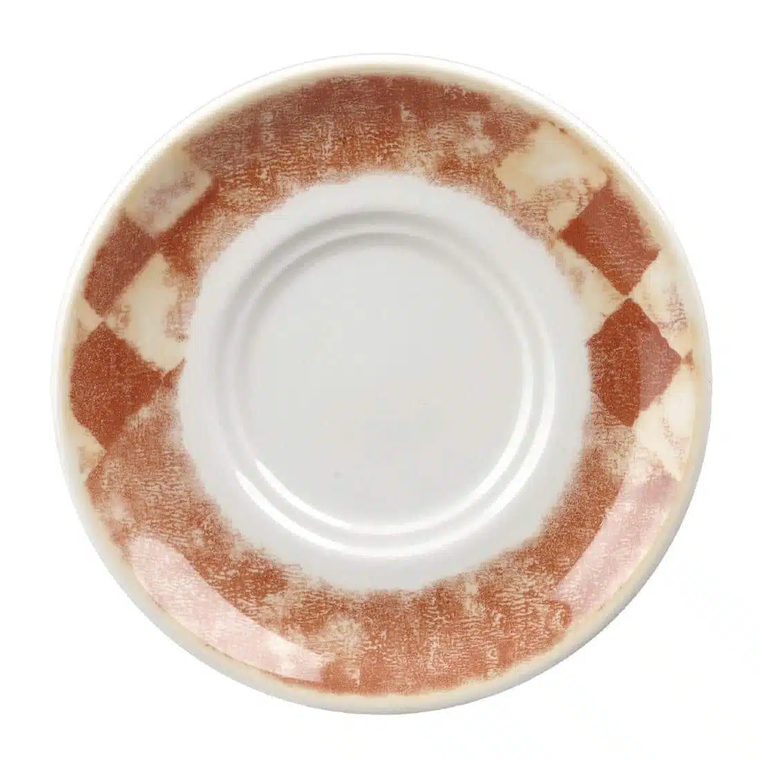 Create a welcoming atmosphere for your customers with the soft colours of Tuscany crockery, designed exclusively by Jeff Banks. This 5.25″ Maple saucer is decorated in rich, warm tones of rustic browns and creams and is made from super vitrified porcelain, offering excellent heat retention, and has a superior glaze which resists the erosion caused by regular dishwashing.