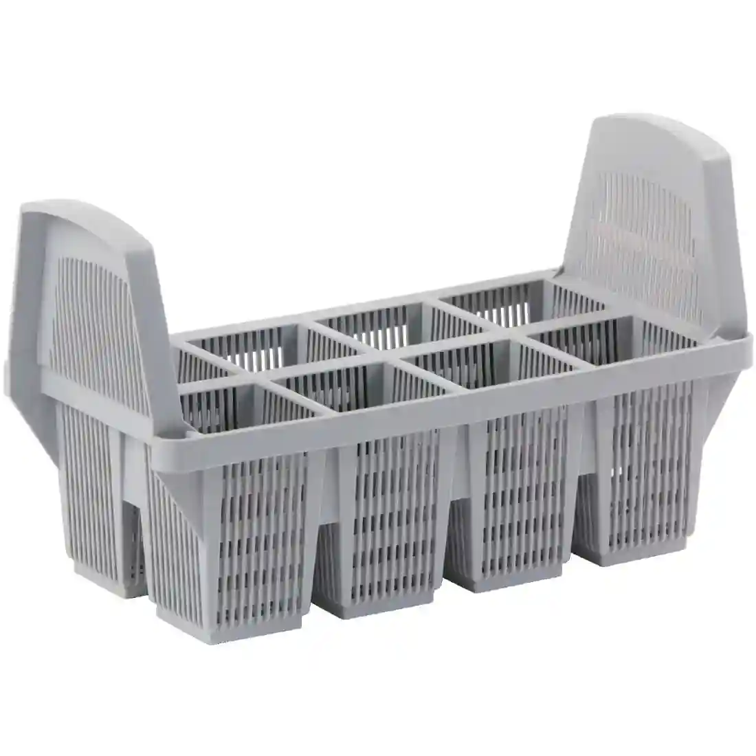 Eight compartment cutlery basket suitable for warewashing.