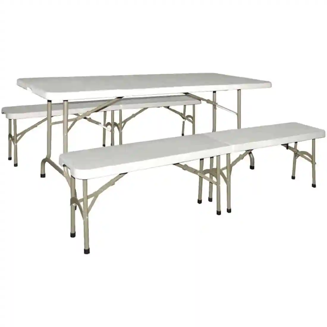Both the table and benches fold down to approx. 3ft, making them fairly easy to transport. The table’s carry handle also makes transportation a little simpler. However, to speed up transport we recommend you use a furniture trolley – especially if you’ll be shifting multiple sets in a single period. Browse our collection of furniture trolleys to find the right one for you.