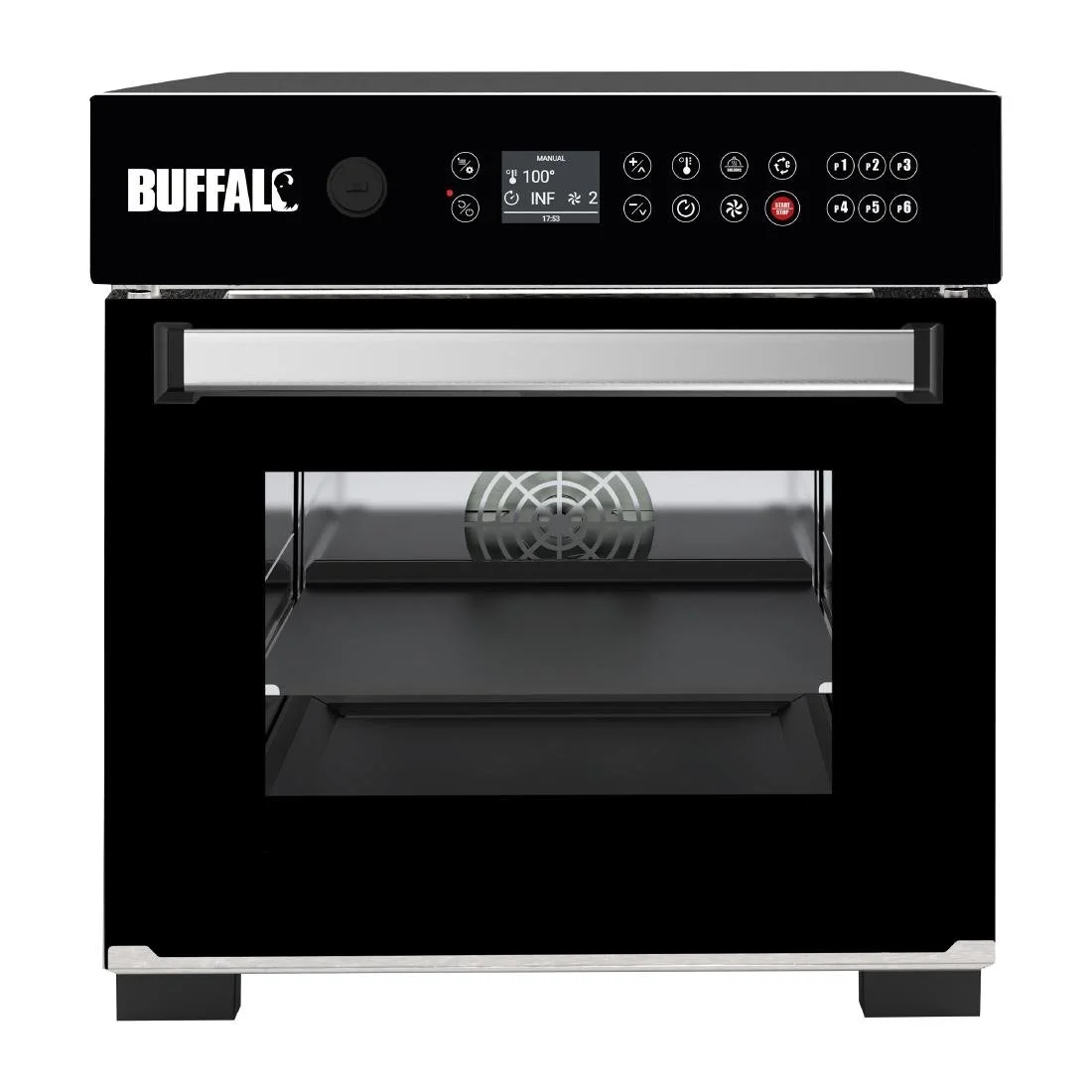 The Buffalo high speed convection oven is the perfect solution for accelerating output without sacrificing quality. Combining powerful forced convection with high¿velocity air impingement, the 2.8kW, 21Ltr capacity rapid¿cook oven delivers much faster cooking, delivering piping hot food with crisp finishes. By using convection and impingement, you can easily cook a 30cm frozen pizza in around 2 minutes 40 seconds, a panini in 1 minute 40 seconds and a portion of frozen chips in 8 minutes – much faster than traditional ovens. The high¿capacity chamber ensures you can cook more at a time, helping you to keep queues moving in cafés, QSRs and hotel breakfast bars.