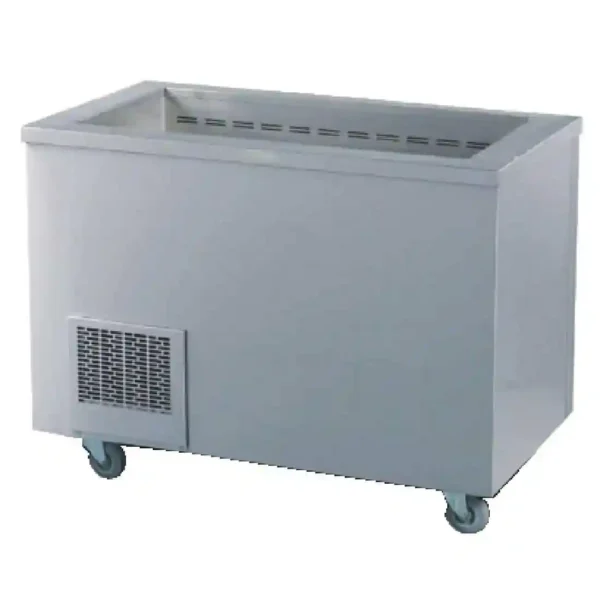 Sturdy refrigerated air well from Victor, constructed from stainless steel with radiused corners for easy cleaning. Operates between 3 and 5 degrees and is suitable for pans up to 65mm deep. Has four heavy duty castors (two lockable) for easy manoeuvrability.