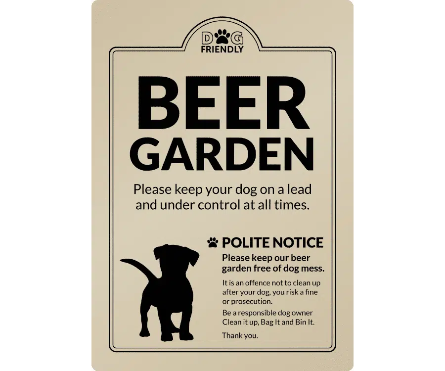 Dog-friendly beer garden notice. Be a responsible dog owner, clean it up, bag it and bin it.