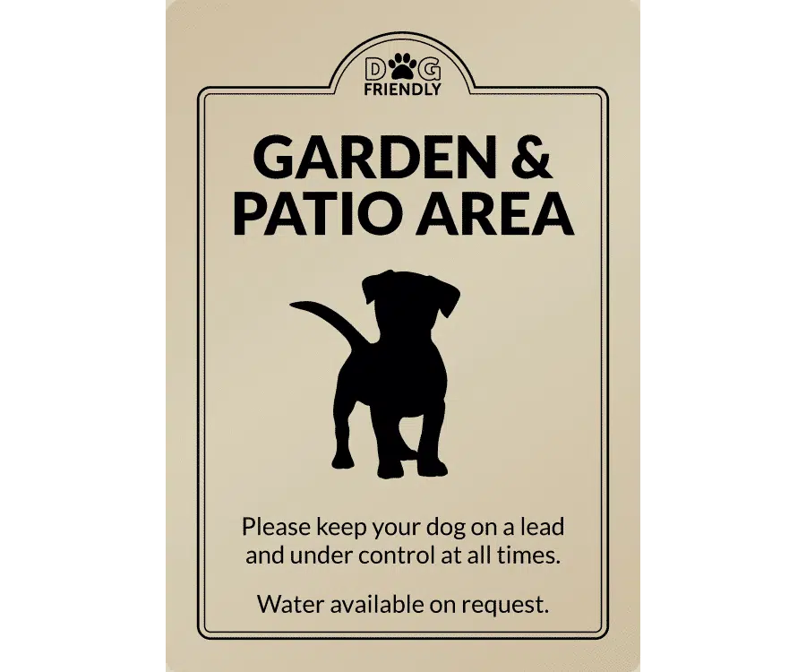 Dog-friendly garden and patio area notice to all pub and restaurant goers.