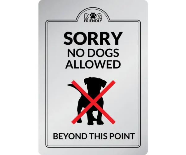The “No Dogs Beyond This Point” sign, featuring a symbol of a dog with a red line through it, is a clear and straightforward way to communicate that dogs are not allowed in that particular area. This signage is essential for maintaining safety, cleanliness, and compliance with regulations in various hospitality settings.