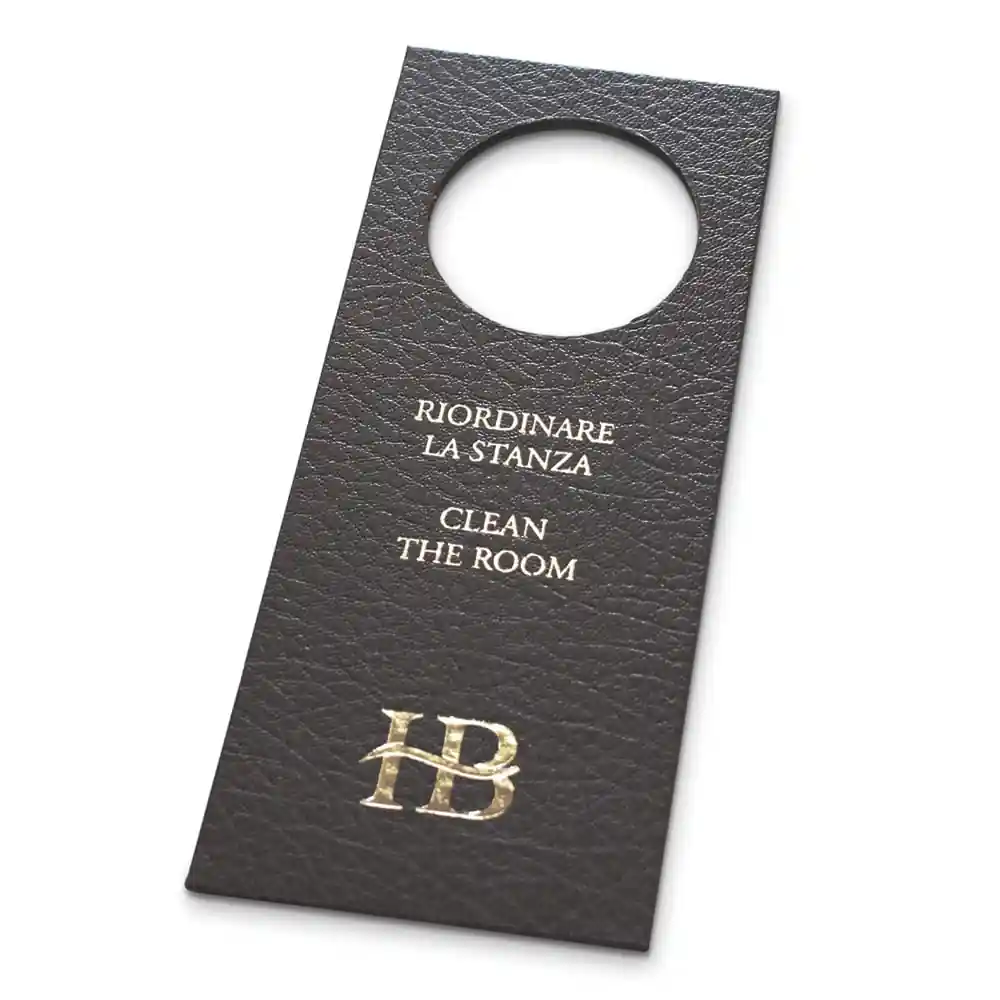 From simulated leather, to bonded leather, recycled leather or pure hide – Hotel Room Door Hangers can be fully personalised with your own logo and come with the option of standard or custom printing with your own logo and text, and so can therefore be set to ‘clean room’, ‘do not disturb’ or ‘laundry’ etc.