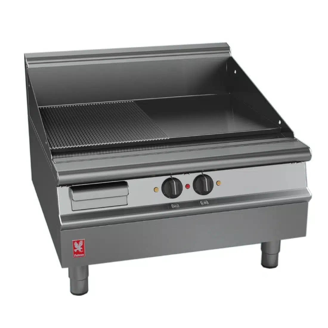 Designed for the busiest of professional kitchens, the E3481R Falcon 800mm ribbed griddle is the ideal addition to hotels, restaurants, mobile catering vehicles and many others. The polished steel ribbed griddle plates cooks food such as bacon, sausages, steaks and vegetables with an attractive branded effect, which adds extra value to your menu. The powerful element is controlled by a precise dial thermostat which can reach temperatures of up to 290C – adding versatility and allowing a wide range of foods to be cooked. The stainless steel construction and removable drip tray ensure interruption-free cooking and easy cleaning.
