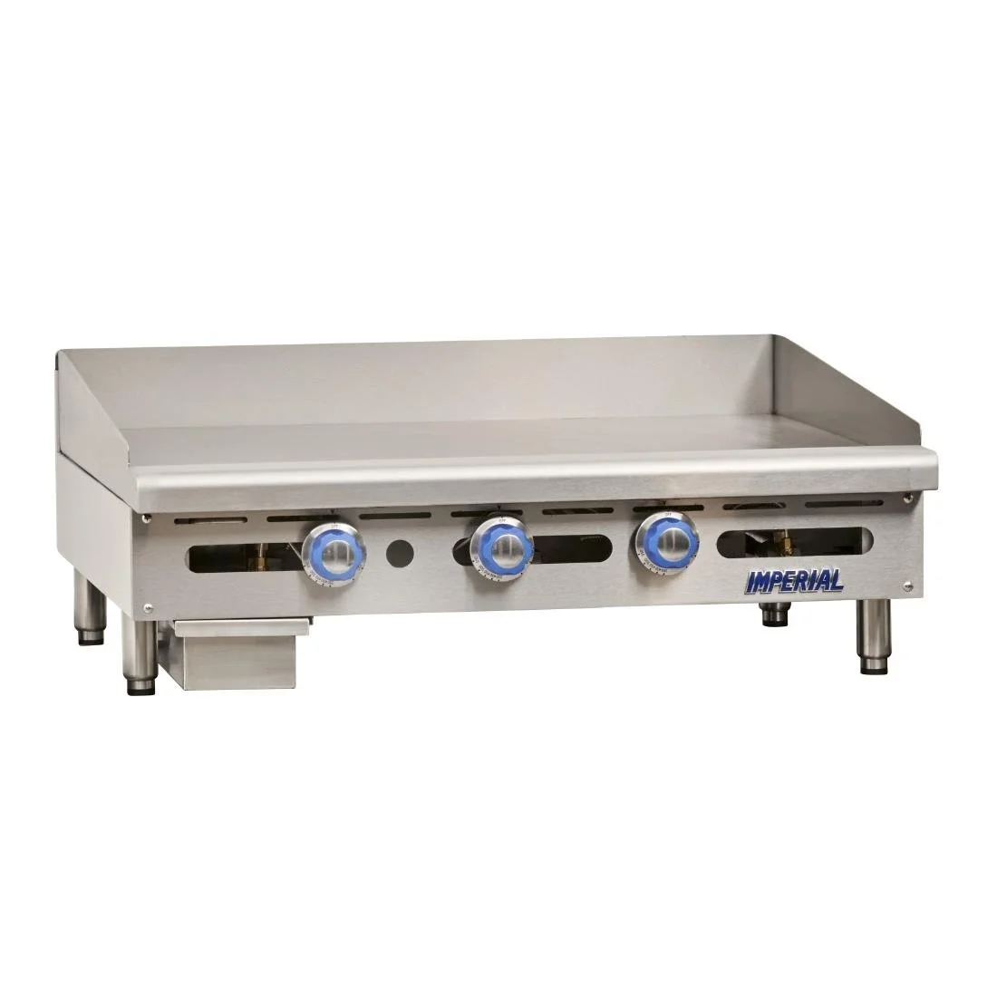 The gas Imperial ITG-36 countertop griddle is equipped with 3 griddle burners with individual, adjustable gas valves and continuous pilots for instant ignition. Aeration baffles between the burners, along with the full width rear flue, evenly distribute heat across the entire griddle plate for exceptional cooking results.