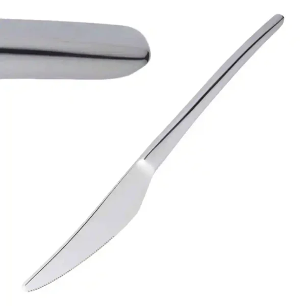 Unusually crafted and beautifully shaped with heavyweight solid handled knives which can be stood upright on the table or laid flat in the traditional manner. Crafted in the highest quality 18/10 stainless steel.