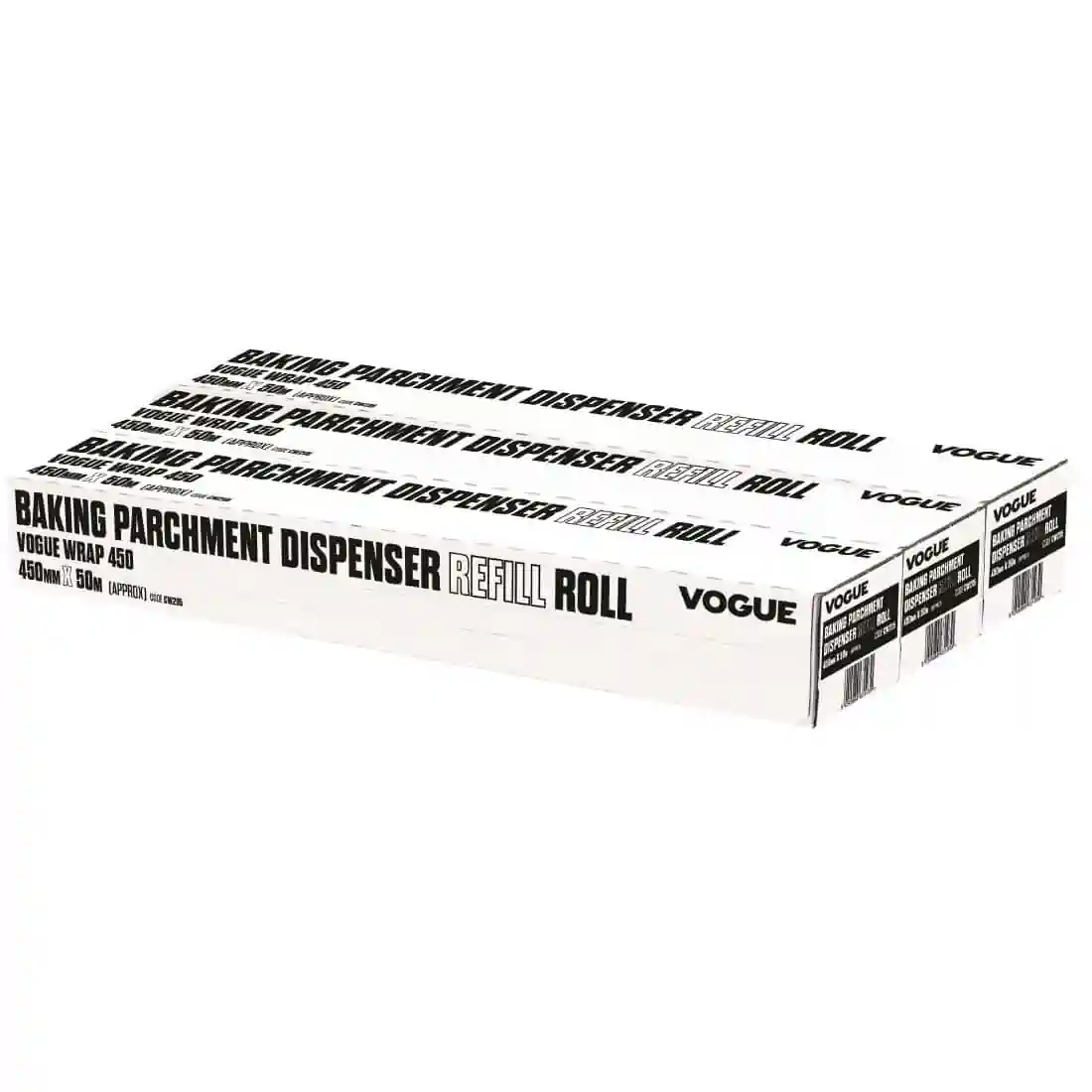 Stop your cookies from sticking with this baking parchment refill for the Vogue Wrap450 Dispenser. Designed to save you valuable time by being easy to dispense, these 50m rolls of parchment are wrapped for convenience and made to withstand the highest oven temperatures with ease. Foil and clingfilm refills also available.