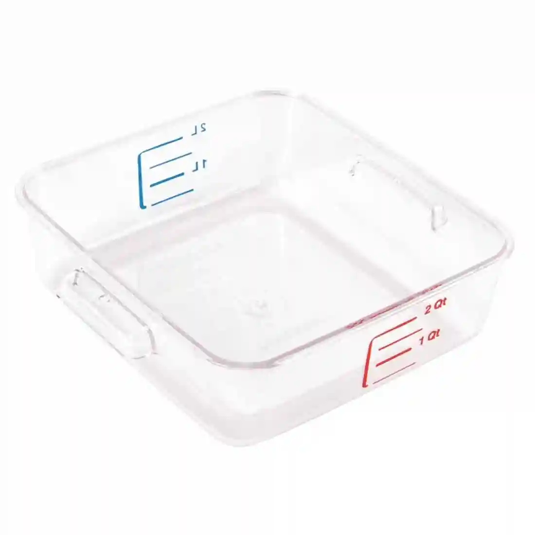 Pocket style handles, Airtight lid (sold separately). Textured bottom reduces sliding. Easy to stack, saving space. Graduated stamped measures. Comes in 7 convenient sizes. Made from extra strong clear polycarbonate.