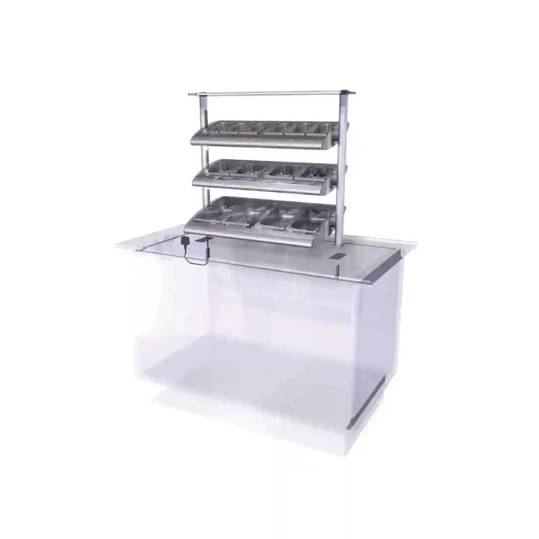 - Display fitted with three levels of inclined shelving & gastronorm storage containers, comprising 6x 1/9 GN (top shelf), 4x 1/6 GN (middle shelf), 4x 1/4 GN (bottom shelf)
