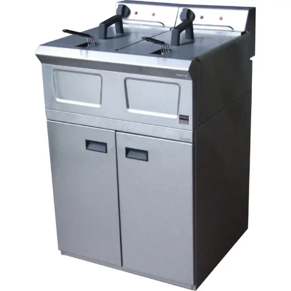 Double Electric Fryer. Power: 2x 6kW. 2x 8Ltr Tanks. 37kg chips/hr. Stainless steel