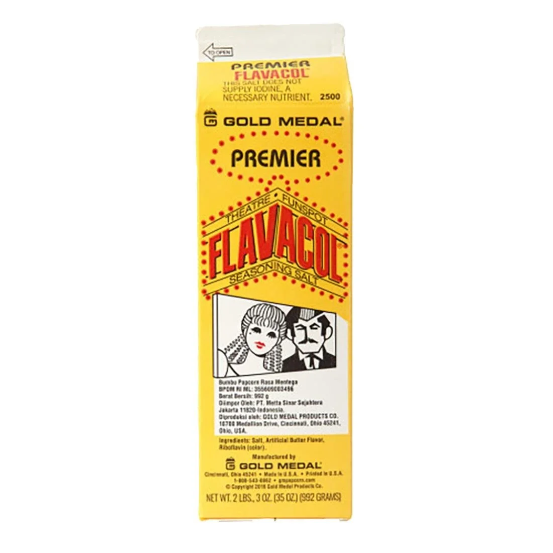 Flavacol premier seasoning salt is made using a proprietary process that results in salt with a finer flake, not a crystal, which naturally sticks better to the popcorn. The result is more salt sensation – but with less sodium. Add this seasoning salt to your popcorn supplies at concessions, cinemas and more.