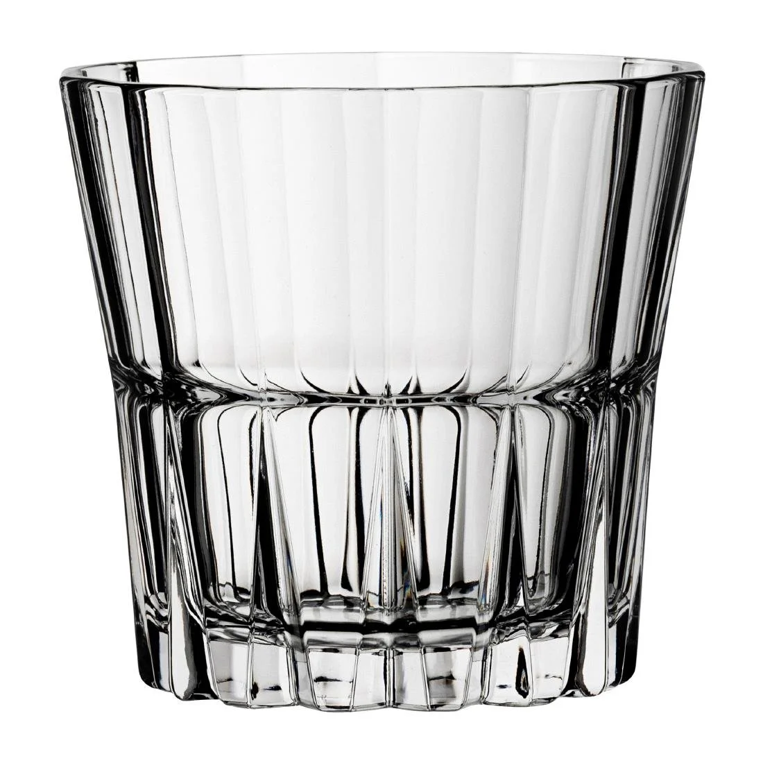 Pasabahce Sword tumblers deliver reliable performance and timeless style for busy bars, restaurants and hospitality settings. Their classic fluted conical profile and deep vertical facets provide a distinctive light catching look that elevates any table service.