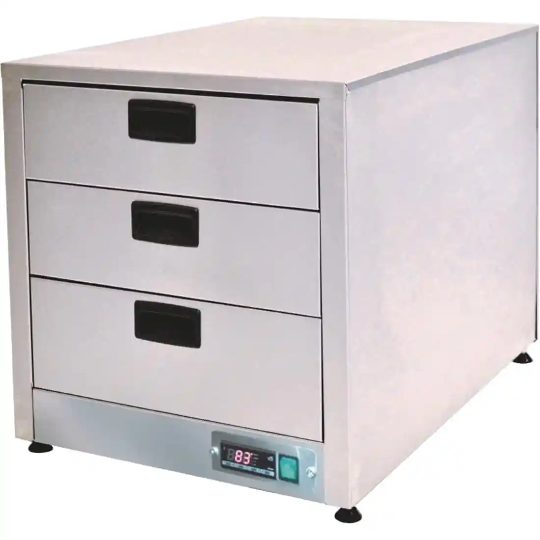 GHD3 heated drawers provide a flexible solution for hot storage of a variety for food products. This compact countertop unit features fan-assisted heating technology for fast heat up and a digital temperature display for accurate control between 30-110°C. A gliding drawer system on extendable runners gives easy access to contents with each drawer being 1/1 GN compatible (pans not supplied). Insulated stainless steel outer panels remain cool to touch.