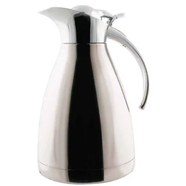 Attractive stainless steel vacuum jug with sealed hinged lid and double wall stainless steel body for improved heat retention.
