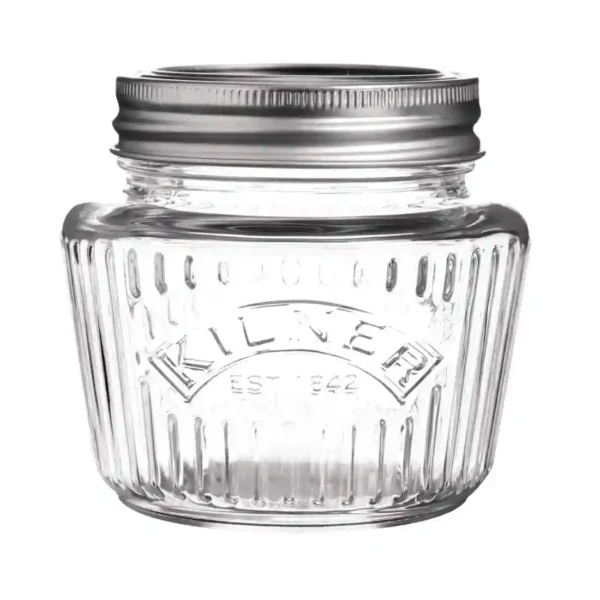New Kilner ribbed vintage preserve jarm features a silver-coloured easy to use metal screw top lid, made up of two pieces, a replaceable vaccum seal and a metal screw band to secure the lid.