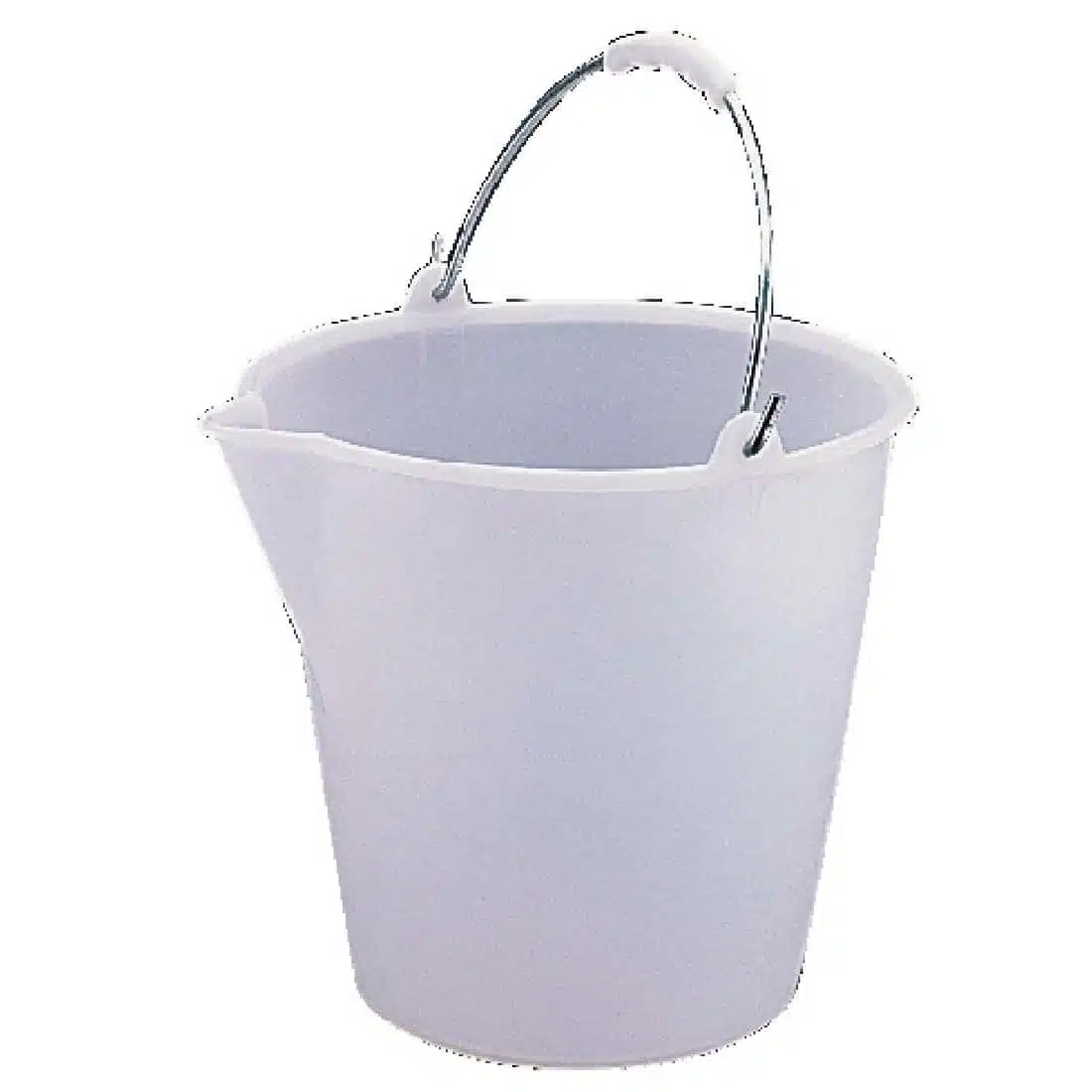 12 litre plastic heavy duty graduated bucket with pouring lip and wire handle with moulded grip.