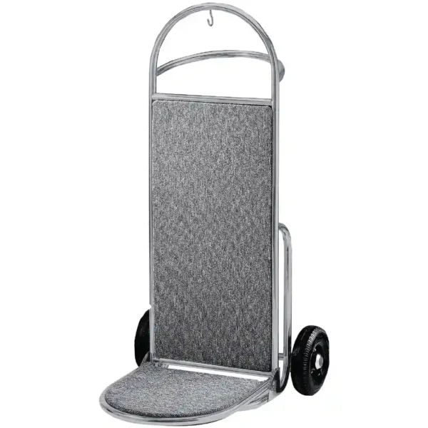 Contemporary and elegant trolley suitable for use in public areas. High load capacity, hanging hook, dual handle and 2 fixed wheels for easy transportation of heavy luggage. Grey carpeted loading base helps protect luggage.