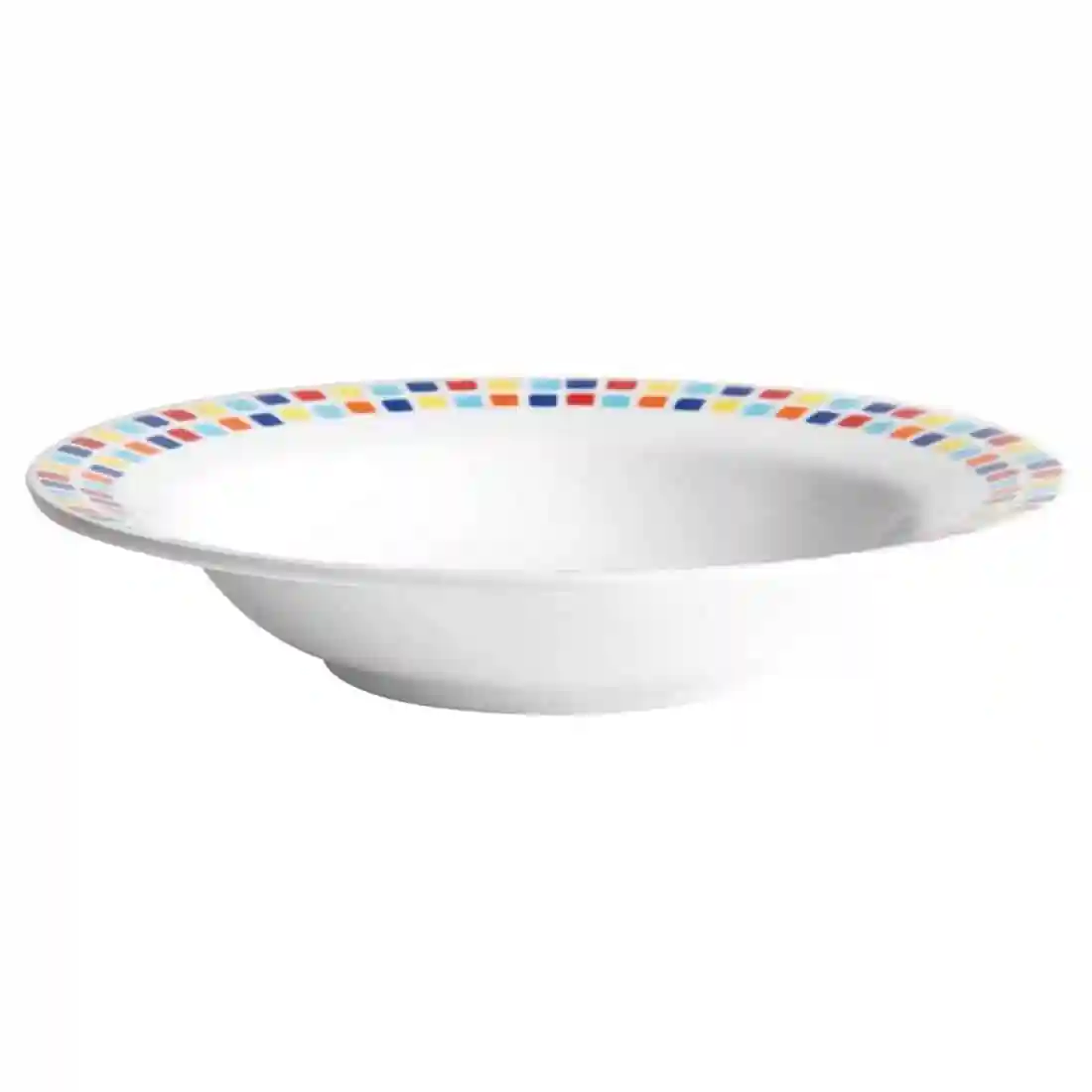 Melamine is a strong, lightweight and hard, thermosetting plastic which is an ideal hygienic and durable alternative to china. These pasta bowls by Carlisle feature a white body with a multi-coloured mosaic effect around the rim; they are perfect for meeting the tough demands of everyday use in schools, hospitals and care homes.