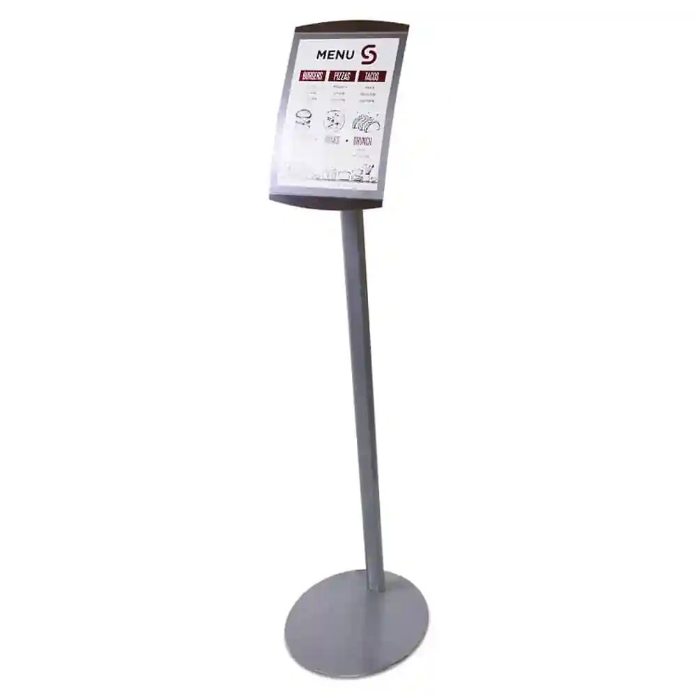 Curved Menu Display Stand. A free-standing curved menu stand for restaurants, great for indoor or outdoor use, with a sleek looking finish.