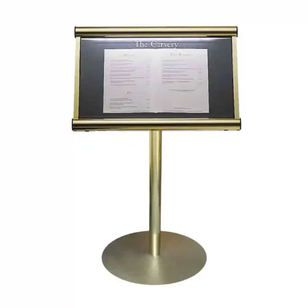Stand Mounted Indoor Menu Display Case. A classic, high quality, free standing menu display case available in a range of sizes and gold or silver colour options.