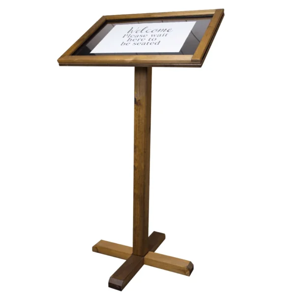 This pine wood Menu Display Stand comes with a stained dark oak finish which gives your establishment a modern rustic feeling. The 2mm acrylic cover provides great clarity for your menu display or chalk message.