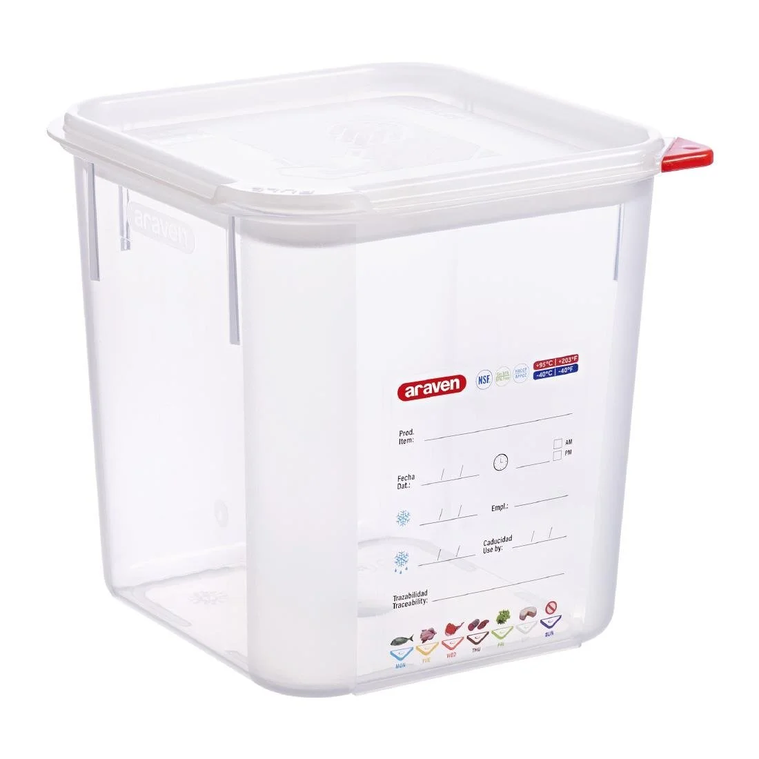 These 4-litre square airtight containers from Araven are ideal for storage of non-perishable goods. Supplied singly, they come with 7 ColorClips to prevent cross-contamination, build in traceability label, measuring scale and side handles for easy handling and transportation.