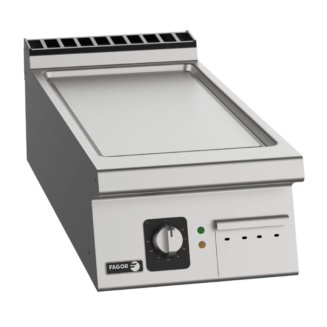Powerful and reliable, the FT-E905 L Fagor 900 Series countertop smooth plate electric griddle provides the perfect cooking surface for busy professional kitchens. Providing an impressive 7.25kW of power across its 400mm wide, 20mm thick mild steel smooth cooking plate, you get a fast heat-up and rapid recovery times – essential for those busy lunch or dinner hours.