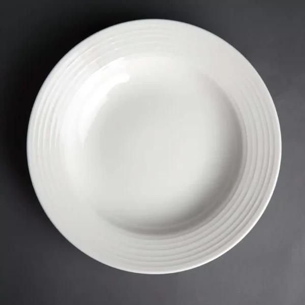 This stylish, 9″ pasta plate from the Linear range by Olympia is made from plain white porcelain and features a delicately embossed lined pattern. The plate is fully vitrified, giving excellent heat and shock resistance and glaze durability, making it robust and able to withstand the rigours of a professional catering establishment.